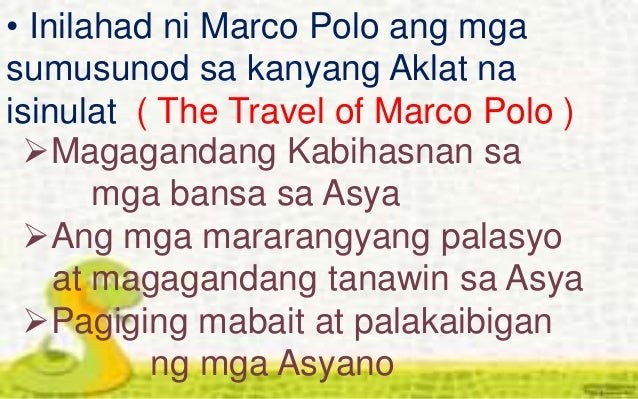 ANG PAGLALAKBAY NI MARCO POLO Si Marco Polo ay isang Italyano. Ito ay batas o paraan ng pamamahala kung saan ang malalaki o makapangyarihang mga bansa ang naghahangad upang palawakin ang kanilang kapangyarihan sa pamamagitan ng pagsakop o paglulunsad ng mga pagtaban o kontrol na pangkabuhayan at pampolitika sa ibabaw ng ibang mga bansa. Mga Dahilan na Nagbunsod sa mga Kanluranin na Magtungo sa Asya 2.